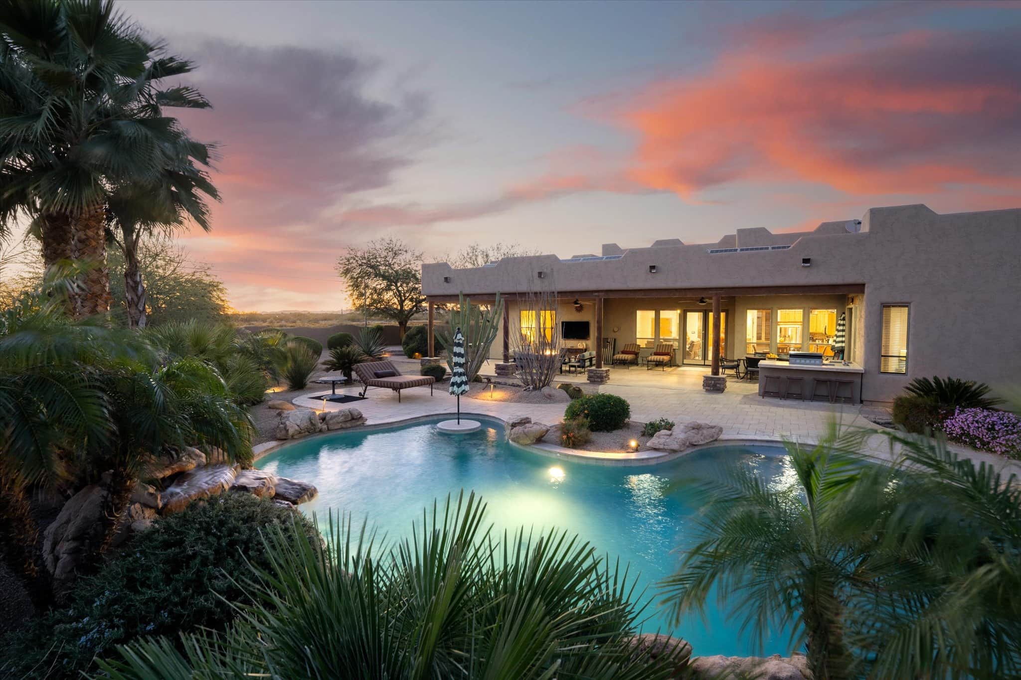 The vast outdoor area features exquisite landscaping with lush desert fauna and an attractive resort-style pool and hot tub. In addition, you’ll have access to a built-in modern barbecue and plenty of cozy patio furniture to host an elegant soiree or any other special occasion.